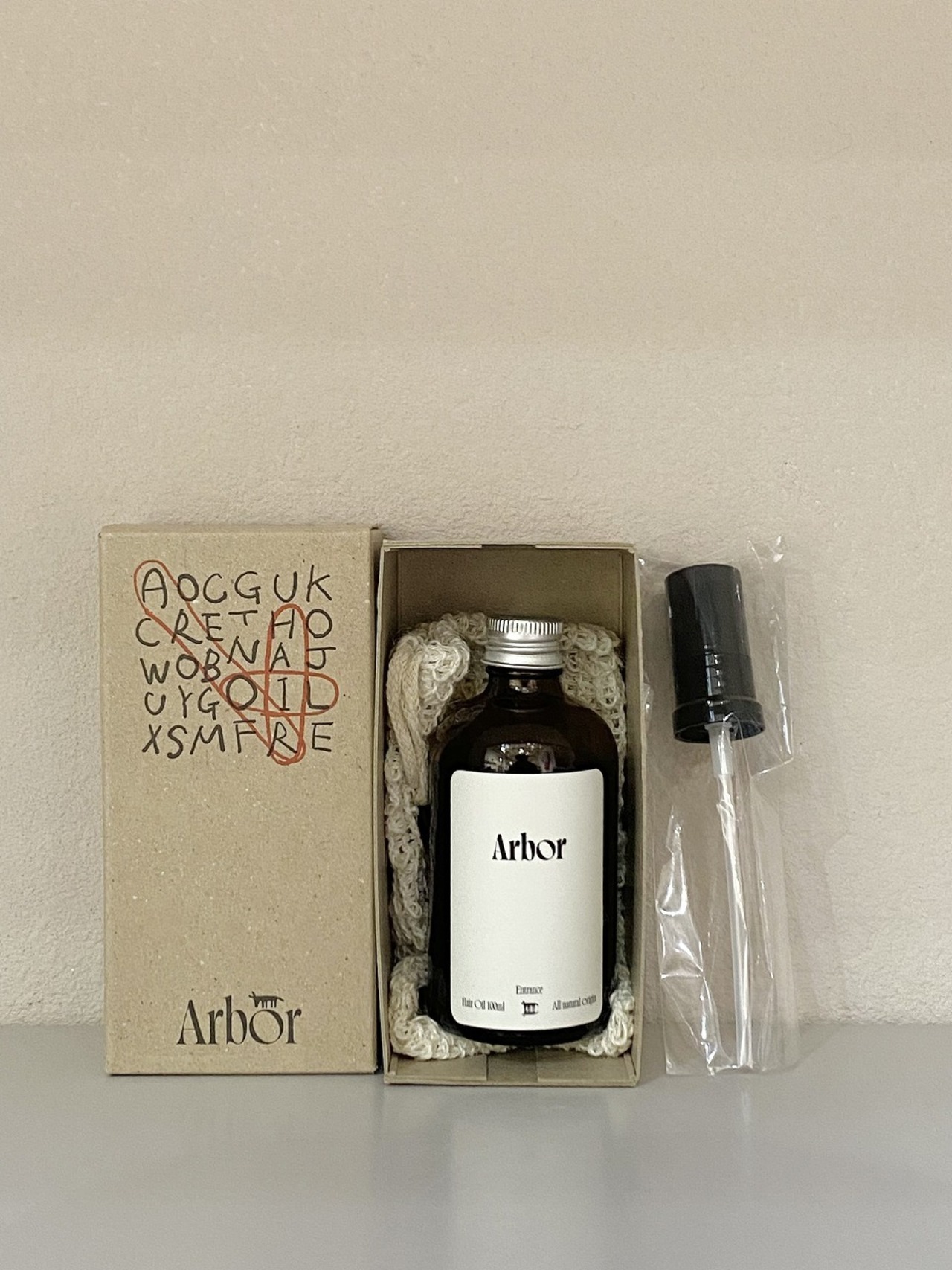 Arborのヘアオイルはトコフェロール(酸化防止剤)以外の成分全てを⾃然由来の成分で製造し、自然本来の香りを届けます。